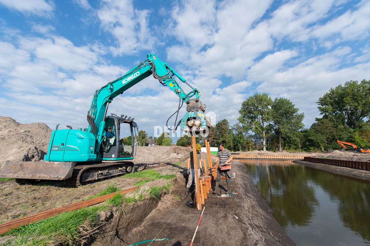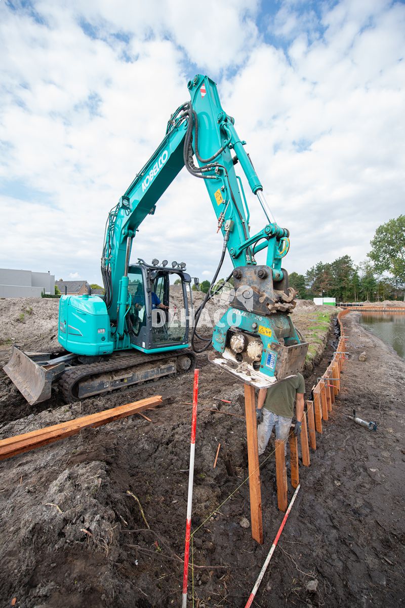 Een hydraulische damwandklem van 350 kN maakt het trilblok geschikt om stalen damwanden te plaatsen.
