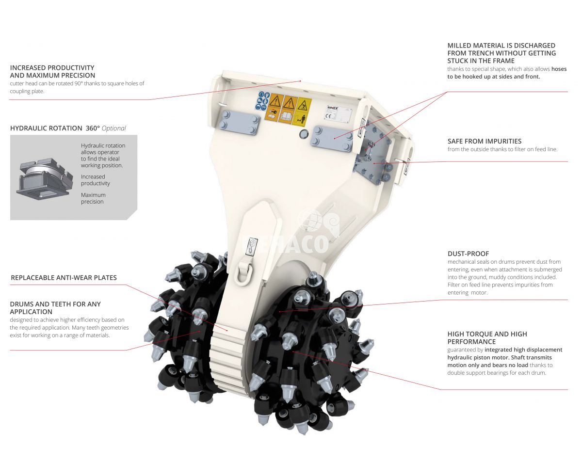 De aanbouwfrezen zijn geschikt voor graafmachines in de klasse van 2,5 tot zelfs 70 ton en kunnen eenvoudig en snel worden gekoppeld aan het circuit voor sloophamers, scharen of grijpers. De frezen hebben een geïntegreerd hydraulisch veiligheidsventiel en op zwaar werk berekende afdichtingen en lagers. De direct aangedreven motor zorgt voor een hoog vermogen, waarbij de uiteindelijke prestatie van elke frees afhangt van de hydraulische afstelling van de betreffende graafmachine.